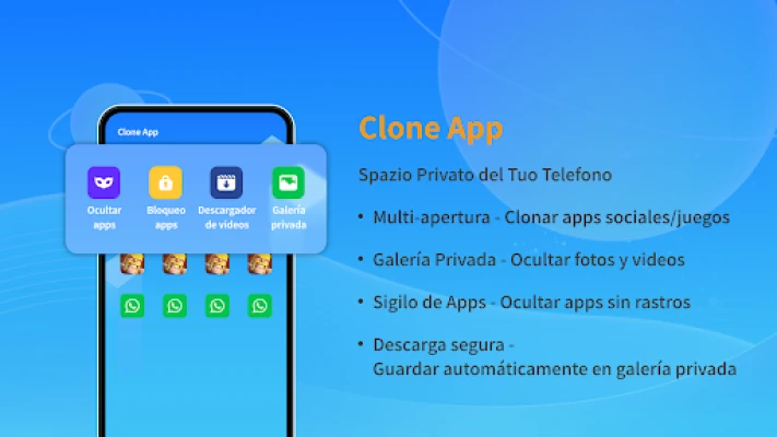 Clone App (XClone App) es un clonador y bóveda privada que crea espacios paralelos para duplicar apps sociales y juegos. Gestiona múltiples cuentas en un solo dispositivo y oculta tus aplicaciones para proteger tu privacidad con Clone App.