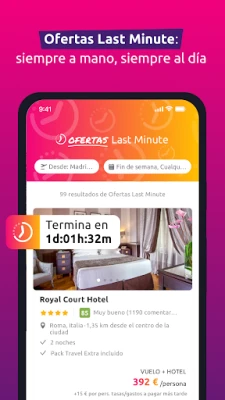 ¿Buscas la mejor oferta para tu próxima escapada? lastminute.com te abre un mundo de oportunidades con ofertas inigualables en vuelos, hoteles y paquetes vacacionales. Descubre precios exclusivos para usuarios de la app, diseñados para garantizar que siempre encuentres las opciones más económicas. Además, deja que la aplicación lastminute.com te inspire con destinos de ensueño y encuentra esas vacaciones "Last Minute" perfectas con total confianza. Con tu área personal, gestionar y reservar es más ágil que nunca: guarda tus datos y los de tus acompañantes para una experiencia de reserva fluida y sin interrupciones.
