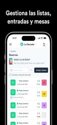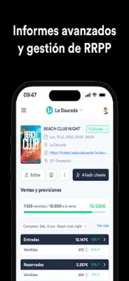 Con Premiumguest Manager, la gestión de equipos de relaciones públicas alcanza un nuevo nivel de sofisticación. Organiza a tus promotores, asigna roles con precisión y monitorea su desempeño en tiempo real, impulsando el alcance y la conversión de cada evento. La venta de entradas se simplifica y personaliza: crea tu portal de ventas bajo tu propia identidad, gestiona listas de invitados exclusivas y controla tus reservas VIP con una fluidez sin precedentes. Desde tu dispositivo, ajusta precios, lanza ofertas especiales y optimiza cada detalle para maximizar tus ingresos.